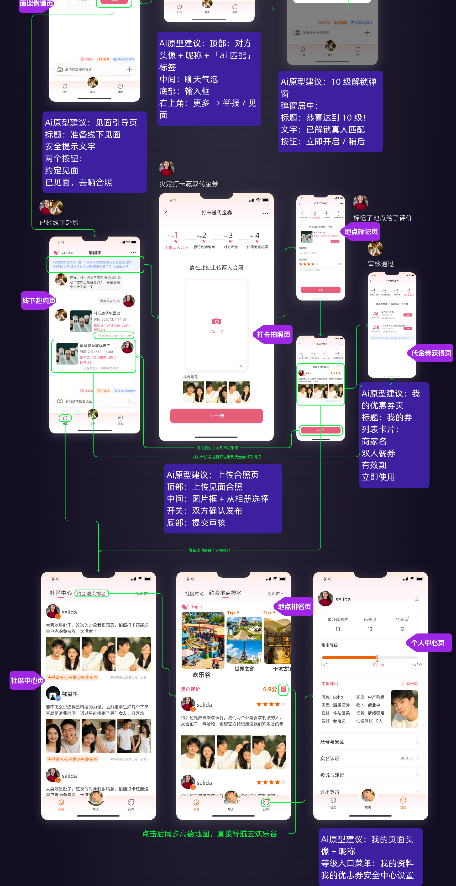 结合AI技术与用户痛点,我们设计了一套“AI陪伴→精准匹配→线下奔赴→消费联动”的完整玩法,拒绝快餐式爱情,主打“认真、精准、靠谱”,每一步都围绕“降低筛选成本、提升匹配精度”展开,具体玩法如下:
