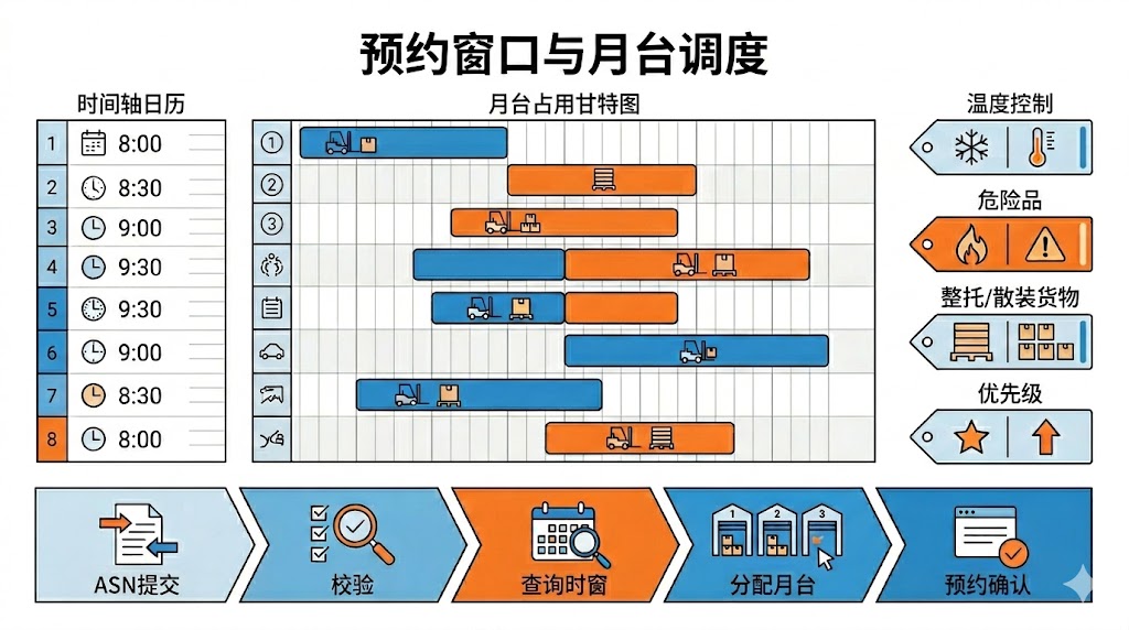 预约时窗不是“让对方选时间”,而是把仓库的产能约束显式化: