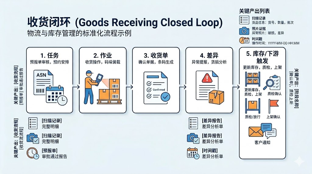 因此,收货管理的核心不是“录入”,而是把每一次接收动作变成可追溯的业务事实:谁在何时何地,以什么依据,接收了哪些货,产生了什么差异,采取了什么处置。