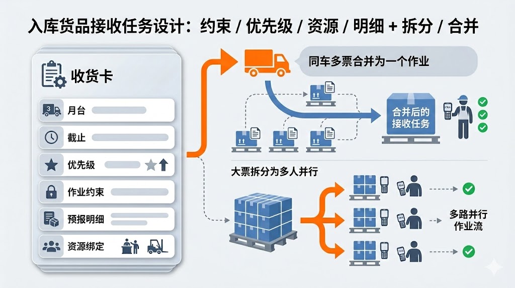 产品上有一个容易被忽略的点:任务必须能拆分与合并。例如同一车多票货,现场可以按“同货主/同区域”合并收货作业;反过来大票货又要拆给多名收货员并行执行。