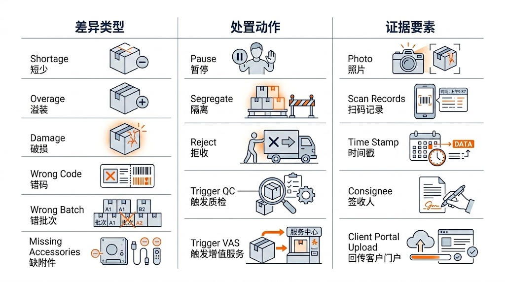 - 差异分类与处置闭环(至少能做到“短少/破损可追溯”)