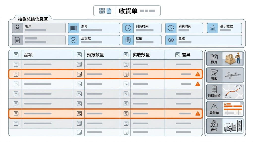在货代仓场景里,收货单不仅用于库存入账,更用于对外沟通与结算对账。收货单建议具备: