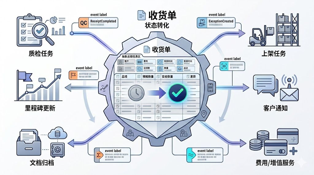 - 收货单触发下游:质检任务、上架任务、里程碑更新、客户通知、文档归档。