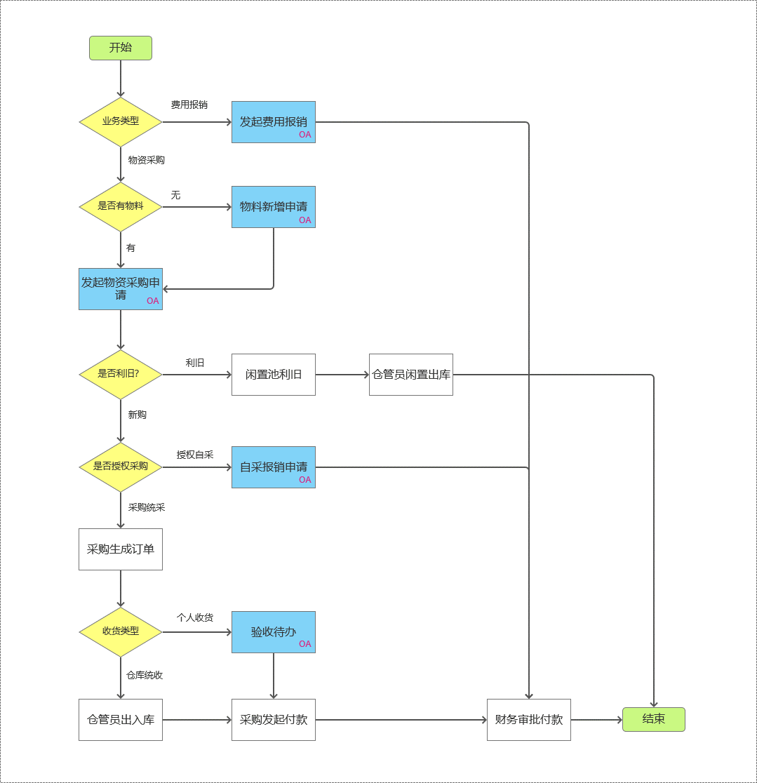 - 他需要先在OA流程中发起物资采购申请,若此时无法选到购买的物料型号,则需要先发起物料新增流程