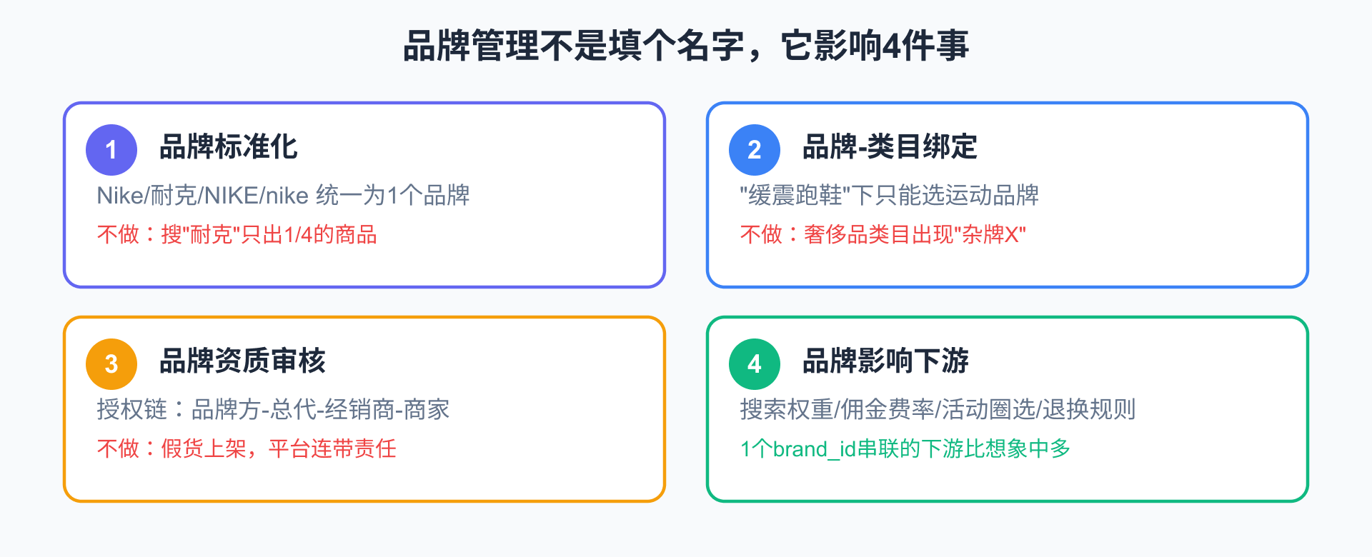 - 品牌是和类目同级的基础数据,不是一个文本字段——品牌标准化影响搜索、筛选和合规