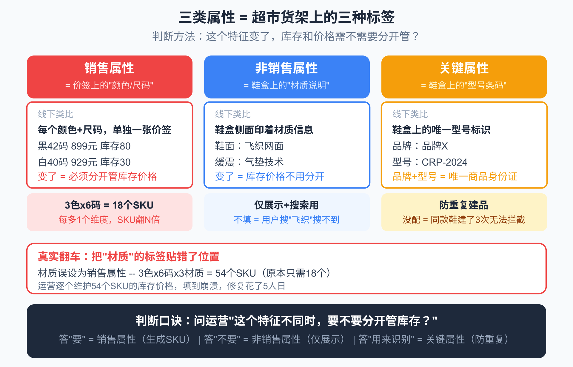 - 鞋面材质变了(飞织网面)→ 不管选什么颜色,材质都一样 → 库存价格不用分开管 → 这就是”非销售属性”