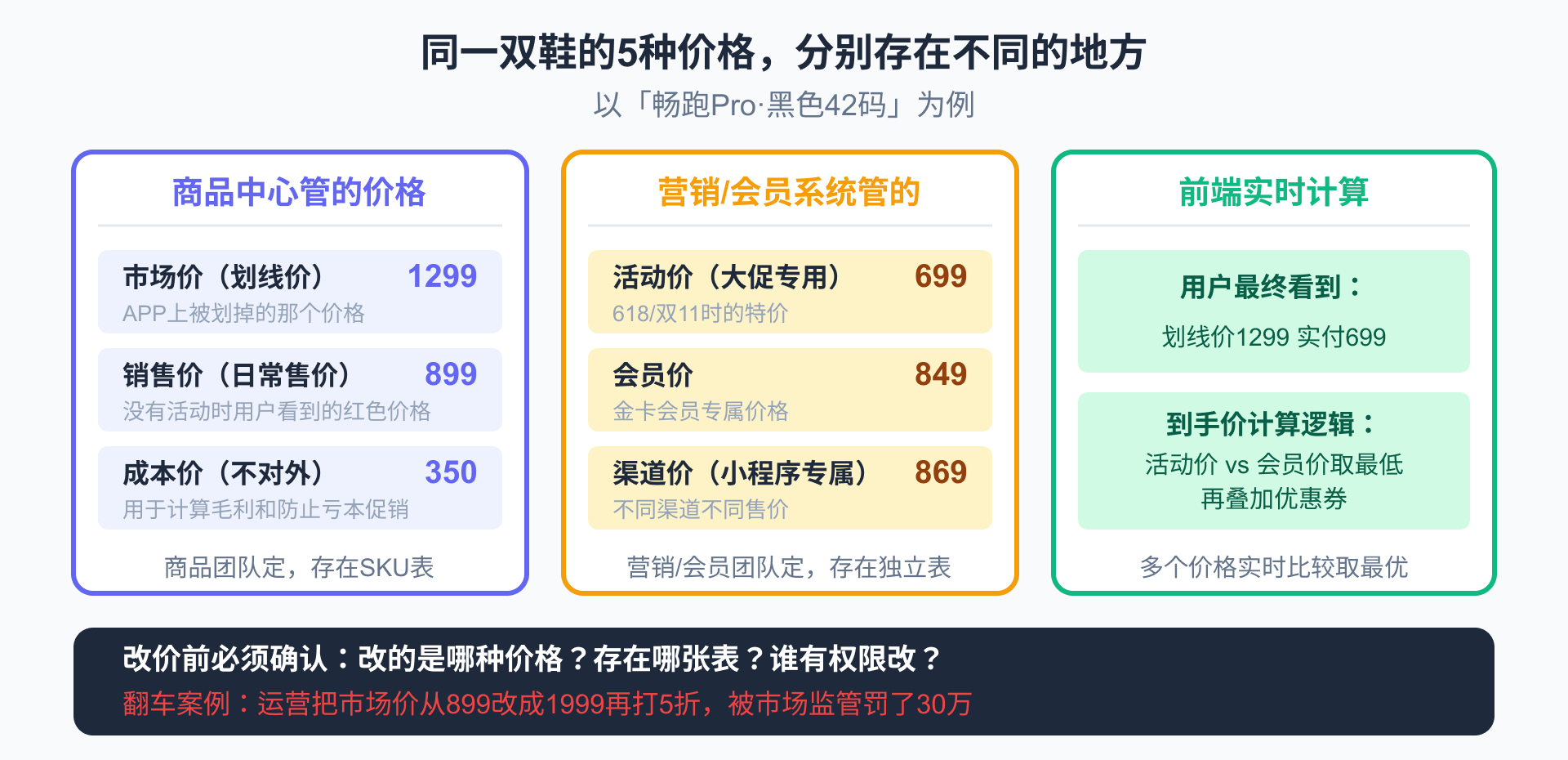 为什么要分这么多种价格? 因为它们归不同的团队管。市场价、日常售价、成本价是商品团队定的;活动价是营销团队在大促时设的;会员价是会员体系算的。如果全混在一个字段里,改价时根本不知道改的是哪个——今天营销改了个活动价,明天日常售价也跟着变了,运营就炸了。