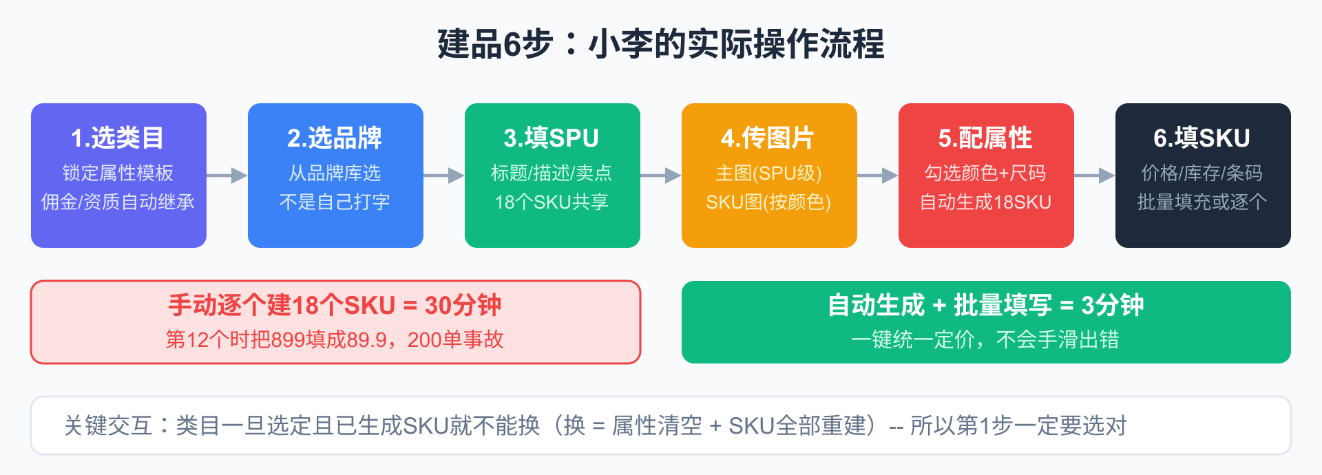建品页面关键细节: 类目一旦选定且已生成SKU,不允许更换。换类目=属性全部清空+SKU全部重建。正确做法是类目锁定,需要换类目时新建SPU。