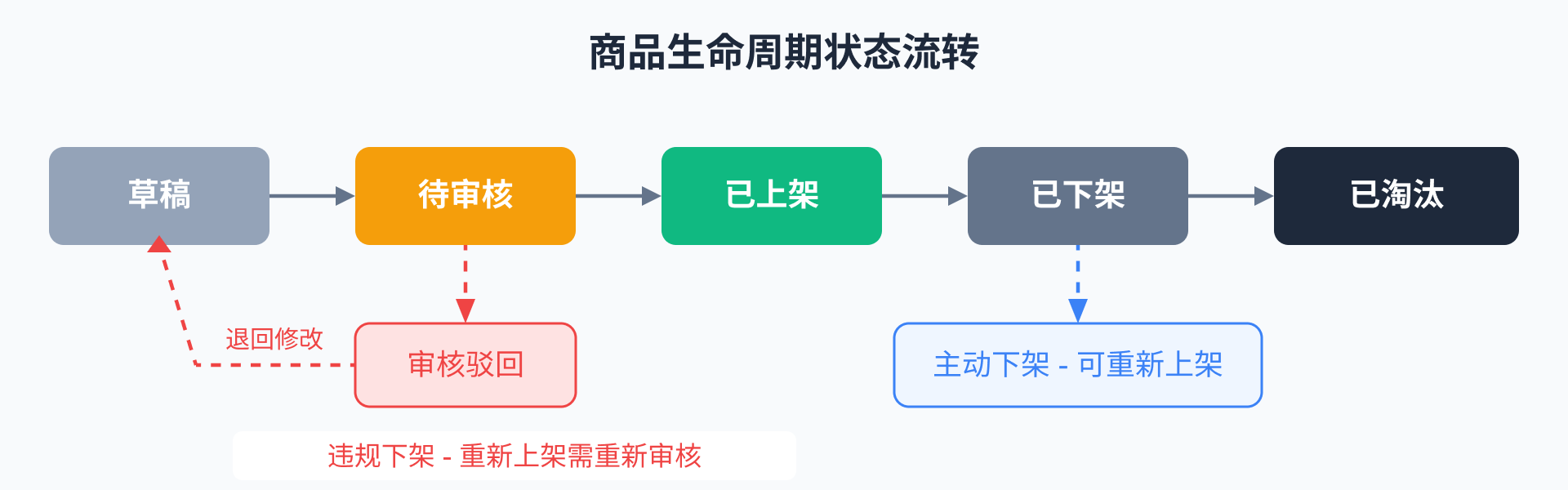 商品不是填完信息就结束了。就像一篇公众号文章要经过”写草稿→编辑审核→发布→必要时删除”,商品也有类似的流程: