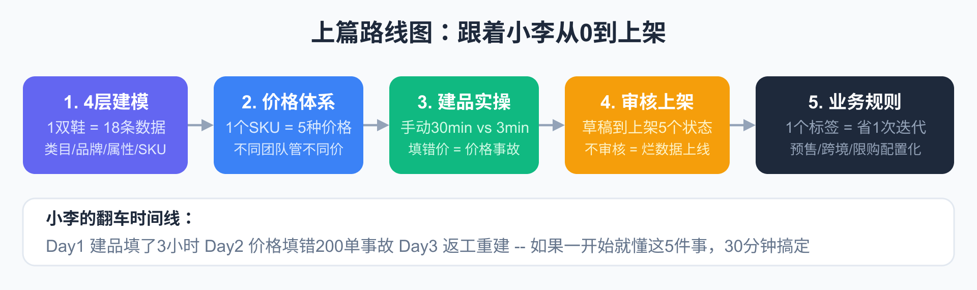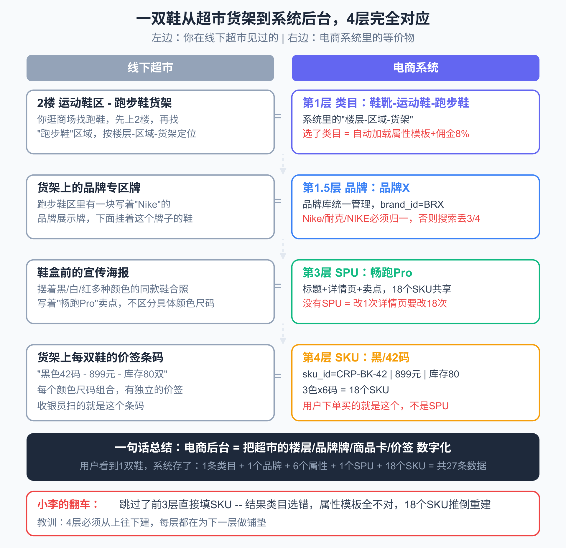 想象一下超市——一双鞋从工厂到货架,需要经过这些步骤:先确定放在哪个货架区(运动鞋区?皮鞋区?),再贴上品牌标签,然后标注它的特征(颜色、尺码),最后每个具体的”黑色42码”单独贴价签、算库存。