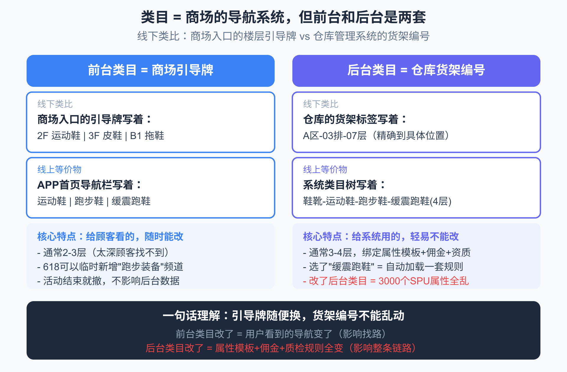 实际项目中的常见争论: 类目到底建几层?后台类目通常3-4层(再多维护成本扛不住),前台类目2-3层(再深用户找不到)。类目太浅,属性模板太粗;类目太深,运营建品时选到怀疑人生。