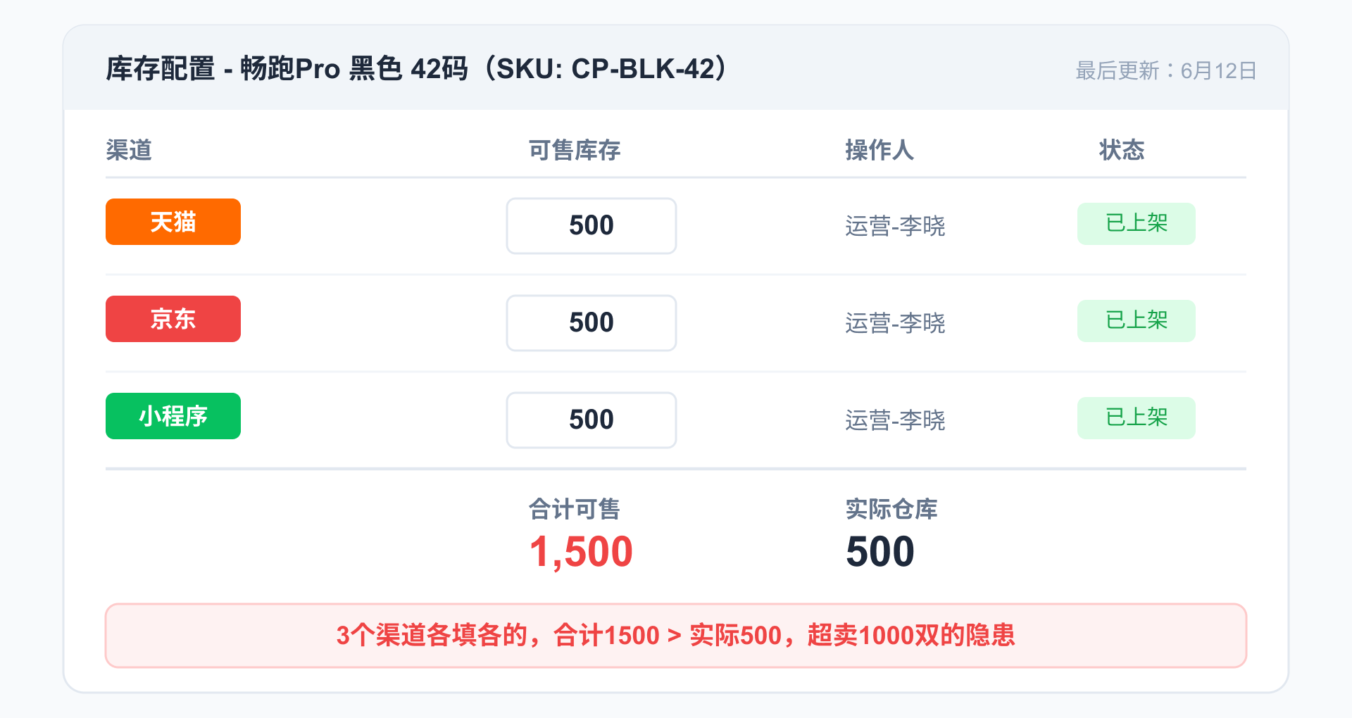 三个渠道各填各的,加起来1500双可售。但仓库里只有500双。