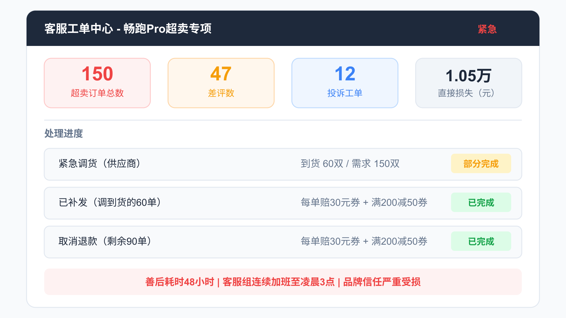接下来的48小时,小王经历了他入职以来最长的两天——客服组加班到凌晨3点处理投诉,运营紧急联系供应商调货(只调到了60双),剩下90单全部取消退款。