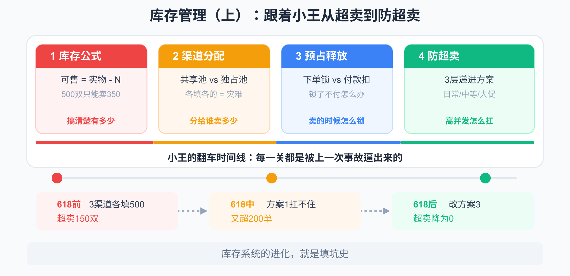 一句话总结: 上篇讲的是库存管理的”地基”——公式算清楚、渠道分合理、预占要释放、超卖要防住、流水要记全。地基打好了,才能应对下篇的进阶场景。