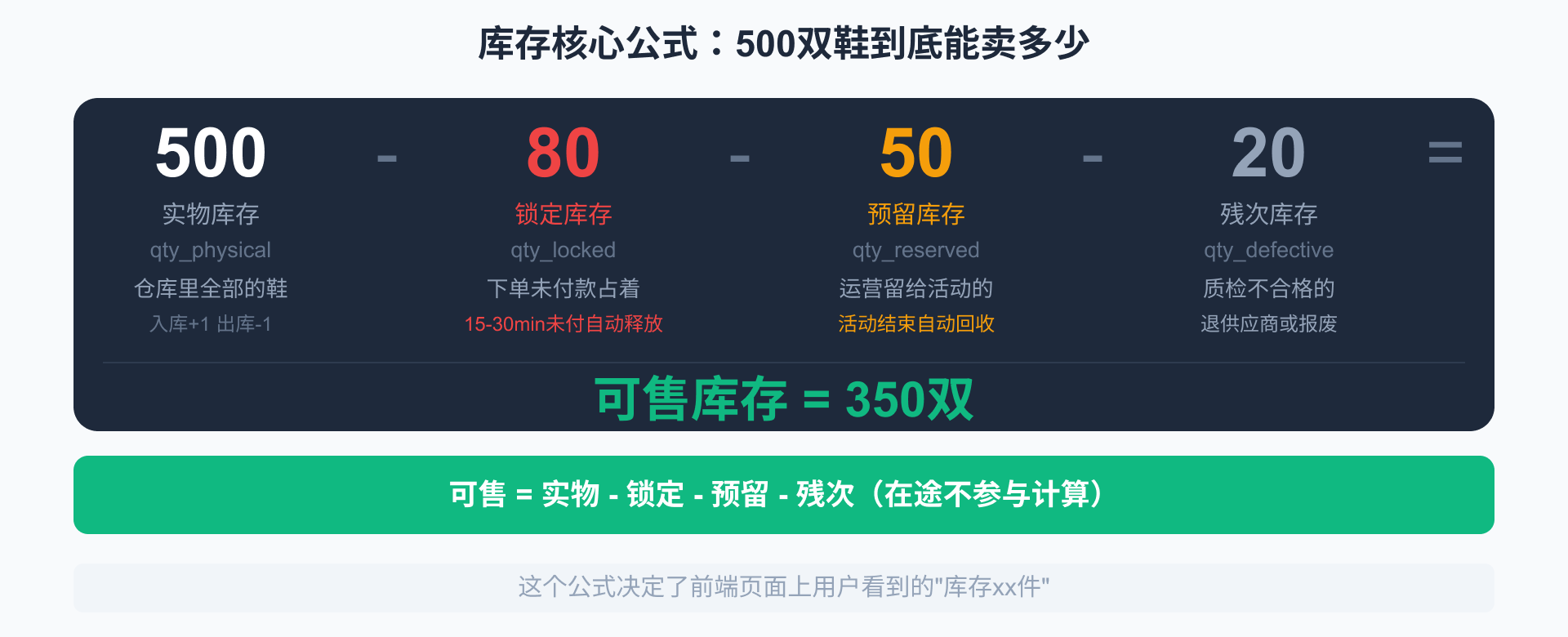 这500双里,80双已经有人下单了还没付款(锁定),50双被运营留给明天的促销活动(预留),还有20双质检不合格等着退供应商(残次)。