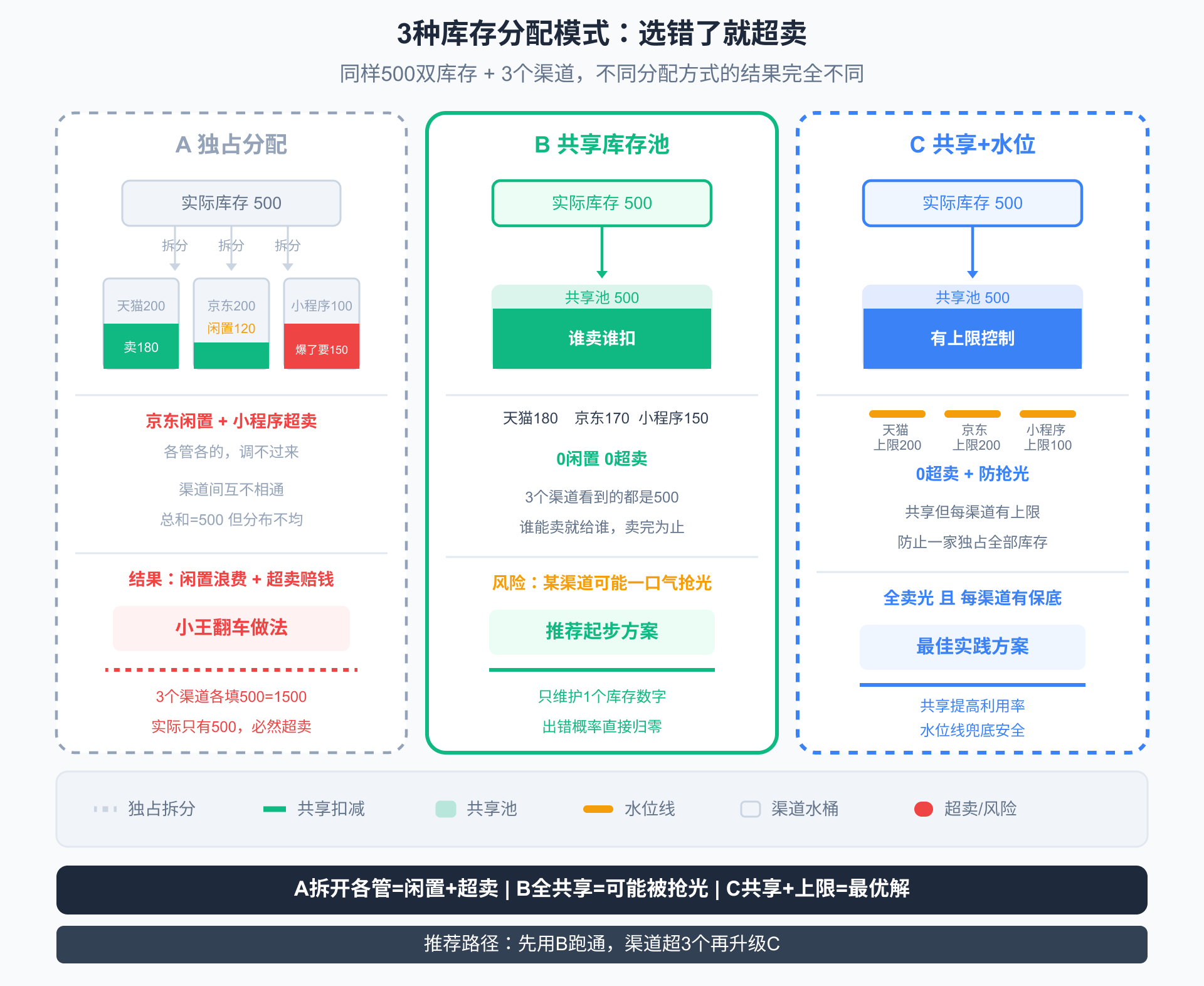 回到小王的翻车现场:3个渠道各填500,加起来1500,实际只有500。问题出在库存分配模式上。