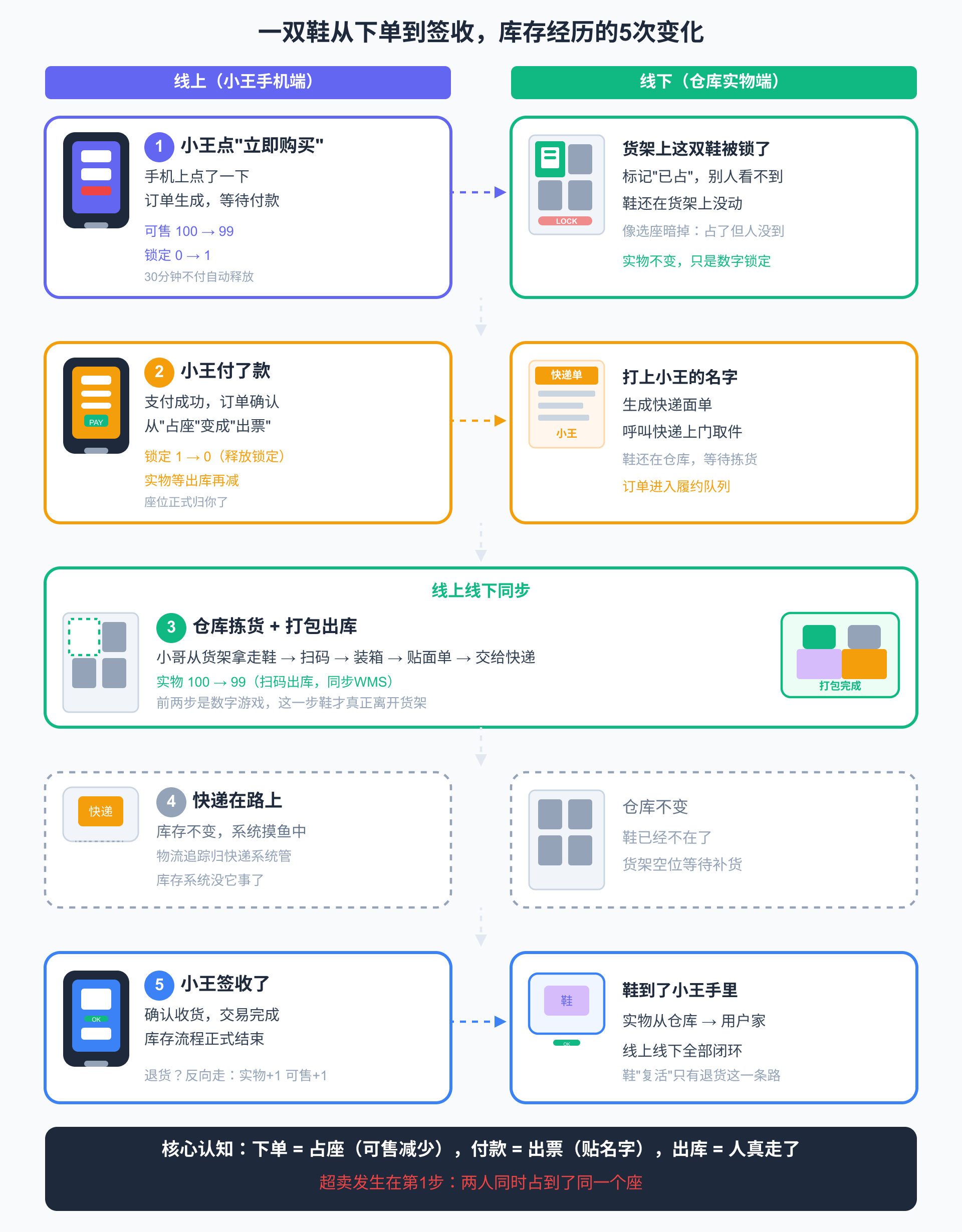 用户在APP上点”立即购买”,到最终收到包裹,库存在系统里经历了一系列状态变化。理解这个流程,才能明白”超卖”到底在哪个环节出了问题。