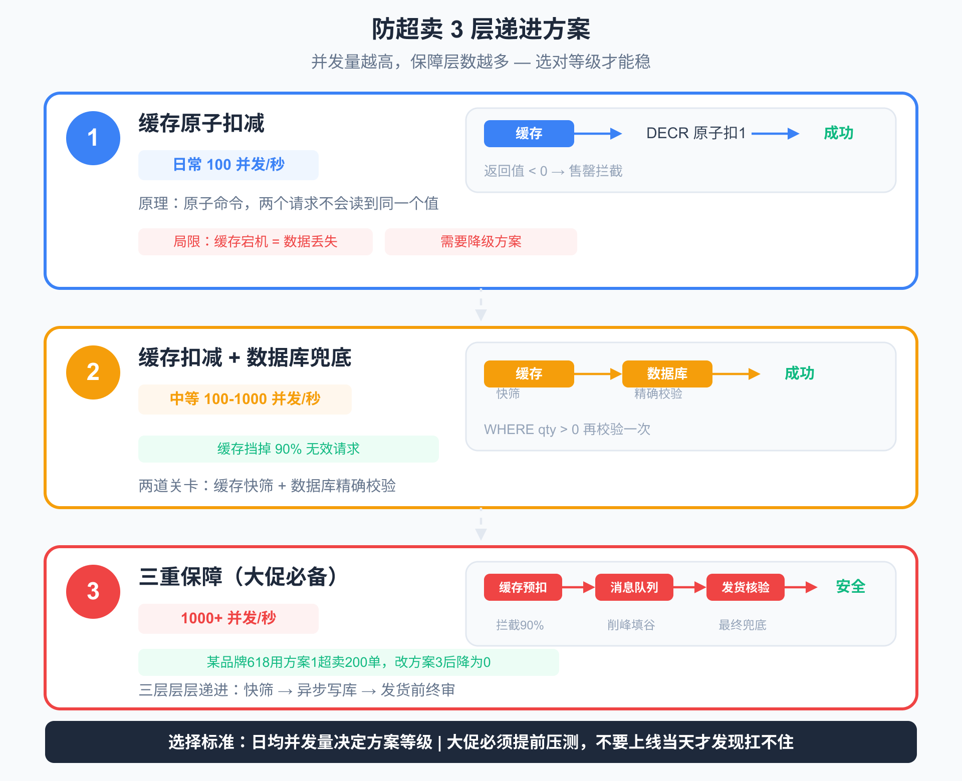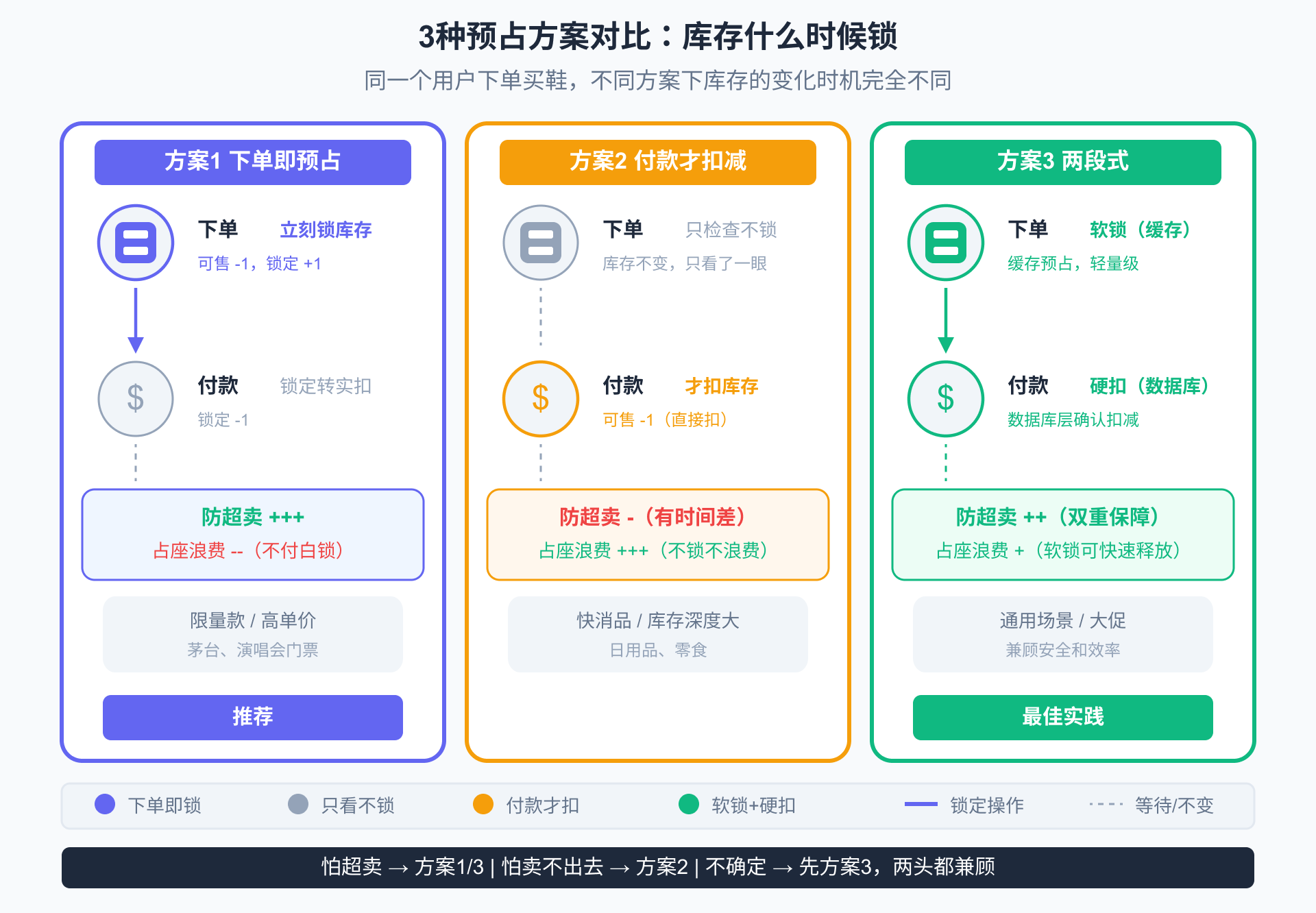 决策标准: 你的业务更怕超卖(用方案1/3),还是更怕”卖不出去”(用方案2)?高单价商品/限量款通常选方案1,快消品/库存深度大的通常选方案2。