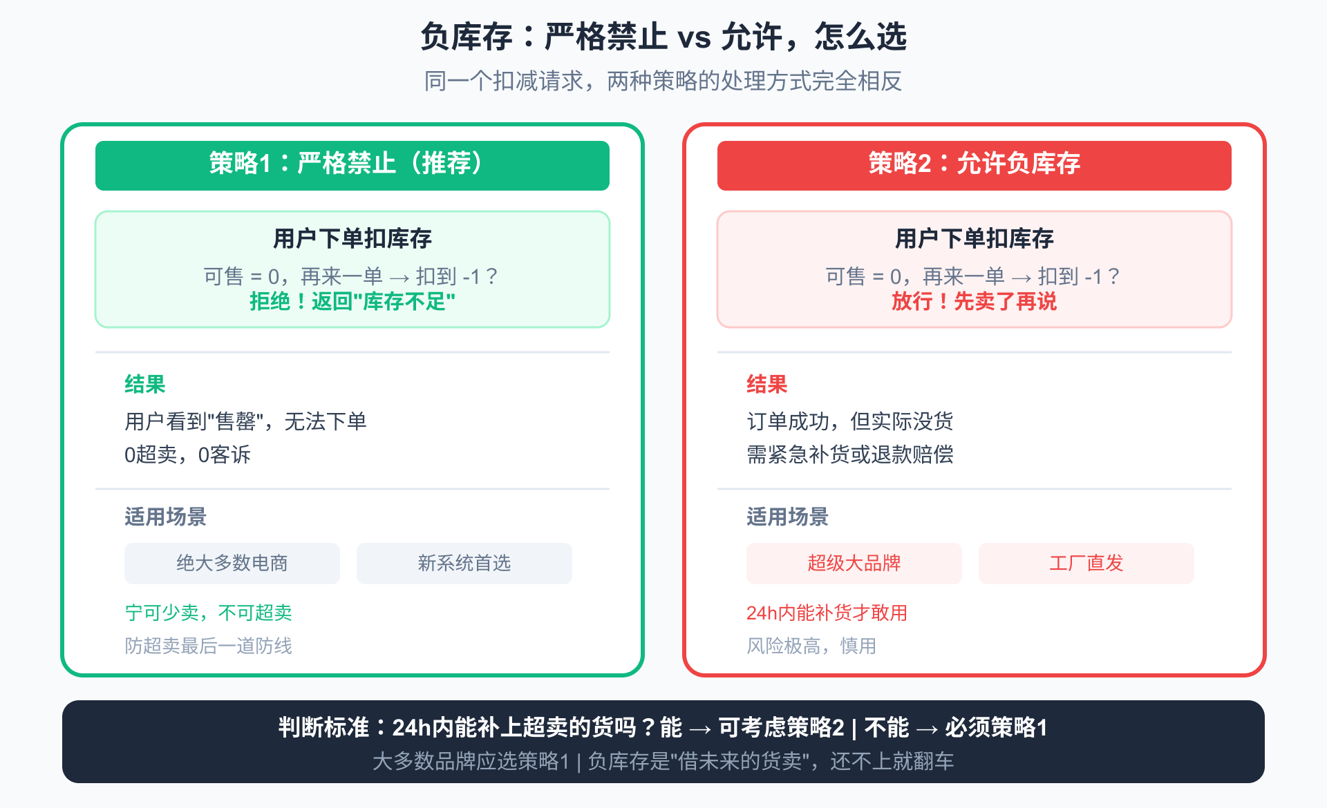 决策标准: 你的业务能在24小时内补上超卖的货吗?能 = 可以考虑允许少量负库存;不能 = 严格禁止。大多数品牌应该选策略1。