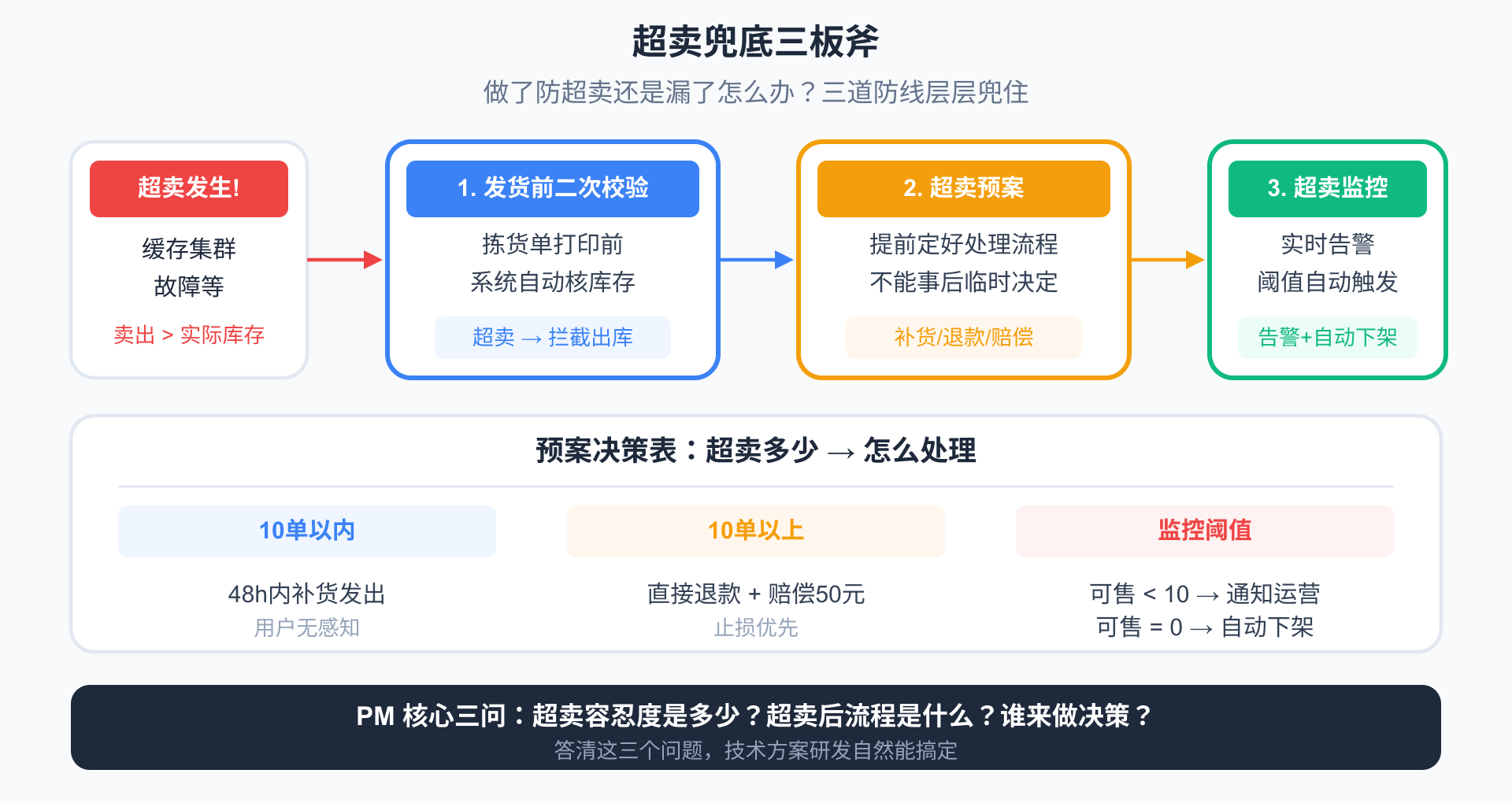 产品经理的核心职责不是写防超卖的技术方案,而是回答三个问题: 超卖容忍度是多少(0?还是允许少量)?超卖后处理流程是什么?谁来做决策?把这三个问题答清楚,技术方案研发自然能搞定。