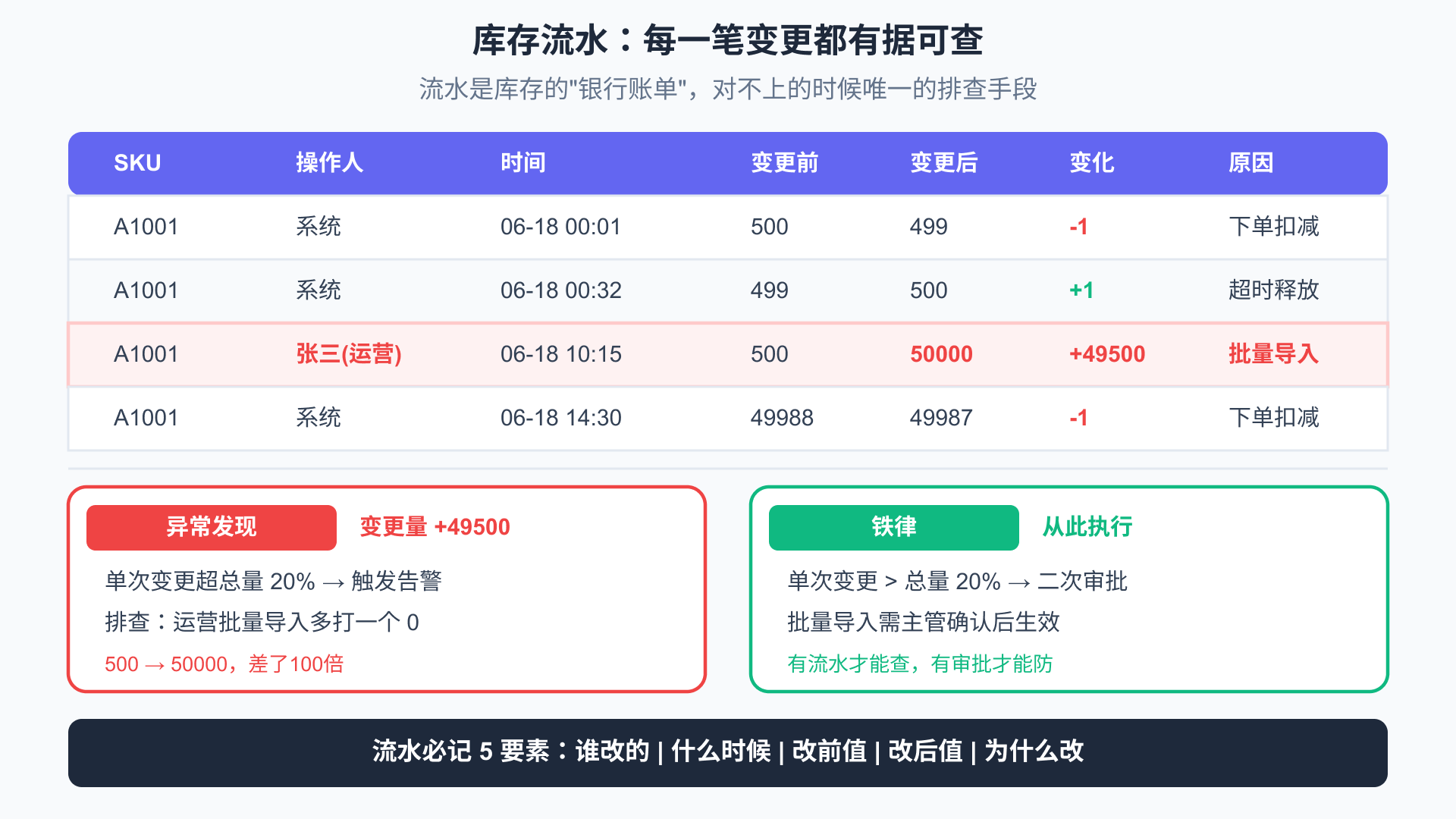 小王的教训: 有一天运营反馈某SKU库存突然从500变成了50000。小王排查了半小时,翻遍了订单和入库记录都对不上。最后在库存流水里发现——是运营批量导入时多打了一个0,从”500″变成了”50000″。流水清楚记录了操作人、操作时间和变更前后的值。如果没有这条流水,这个错误可能到发货时才暴露——已经有30多笔订单冲着50000的库存下了单。从此以后,品牌X 的库存管理后台有一条铁律:任何单次库存变更超过总量20%的操作,必须二次审批。