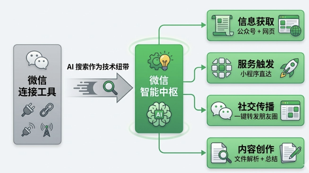 过去十几年,微信连接了人、社交、内容和服务,但这些连接往往是碎片化的。AI 搜索,是第一次真正有可能将这些碎片化生态串联起来的技术纽带。当你在搜索框提问,AI 调动公众号的知识、视频号的演示、小程序的服务,在一次交互中完成全链路闭环——微信正在从一个”连接工具”,进化为一个”智能中枢”。