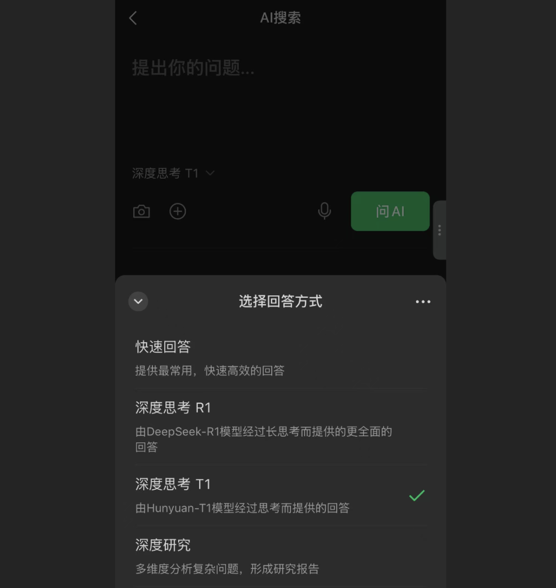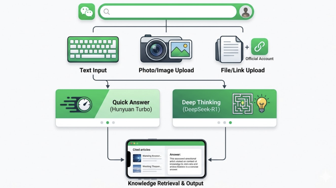 很多早期分析停留在”它有两种模式”的表面。但到 2025 年 9 月,微信 AI 搜索已经完成了一次质的跃升——从双模式文字搜索,进化为集四种推理模式、多模态输入、历史记录与社交分享于一体的综合 AI 入口。