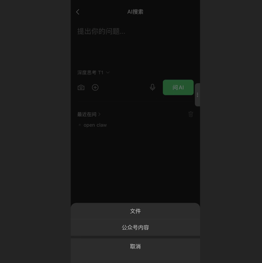而现在,屏幕上出现了三个入口——深度思考、上传图片、上传文件。你选择深度思考,几十秒后,一份结构清晰、引用了十几篇公众号文章和实时网页的深度分析摆在你面前,底部还有”继续提问”的入口,历史问答也被自动保存。