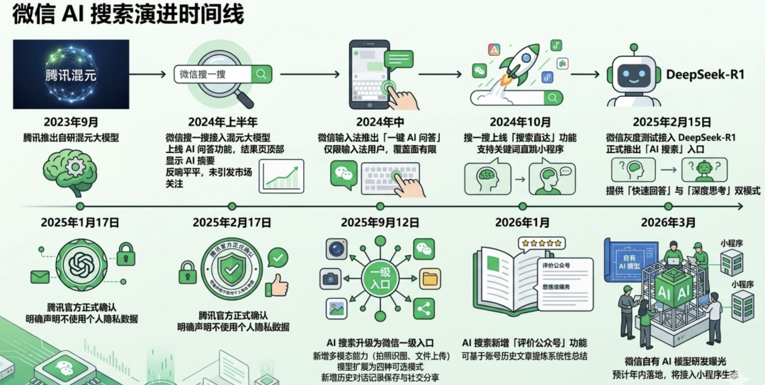 很多人以为微信 AI 搜索是 2025 年 2 月突然冒出来的新物种。但如果拉长观察线,你会发现这件事早有伏笔,且迭代速度远超外界感知。