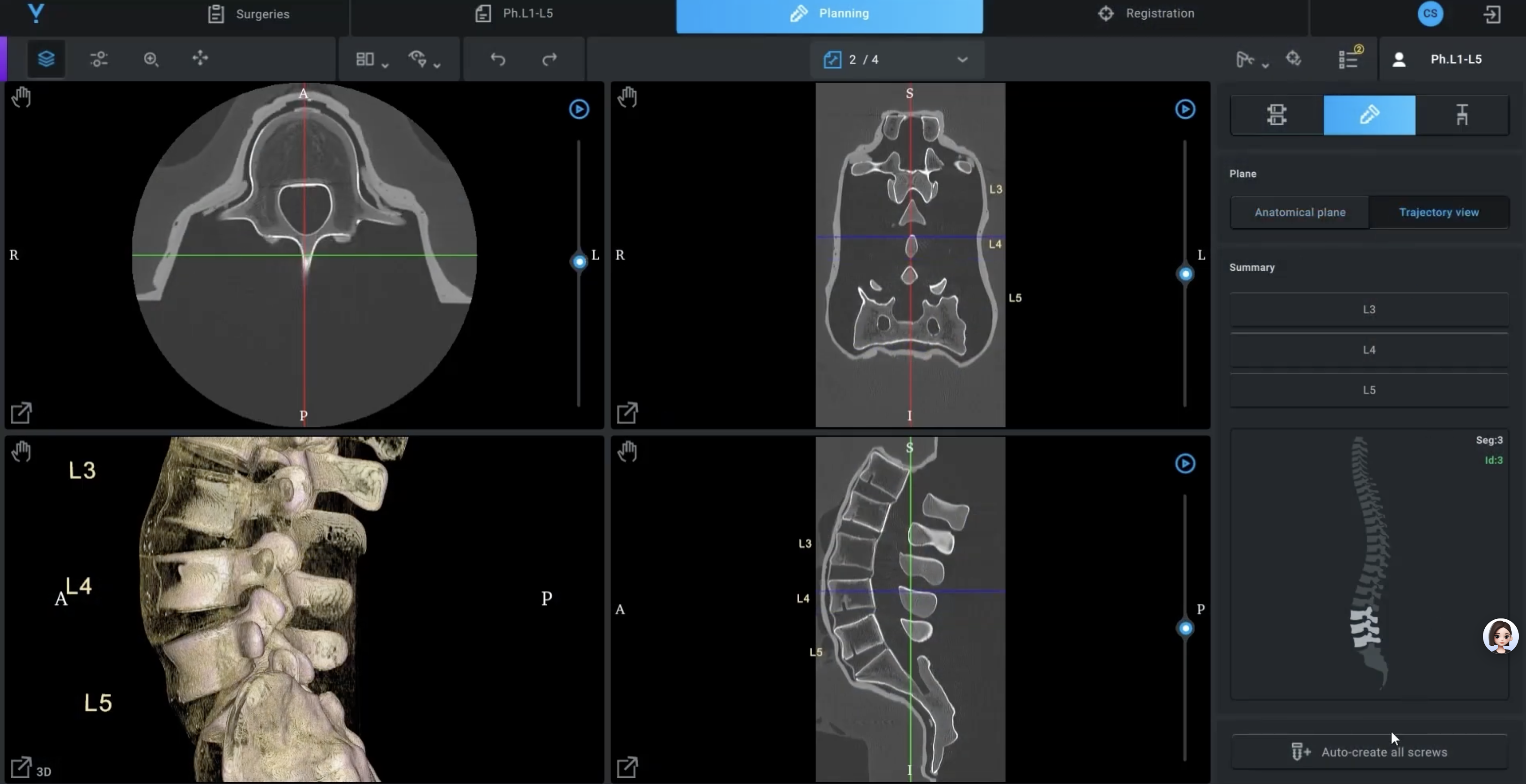 核心功能:通过产品用户界面(UI),系统将患者的术前CT/MRI数据重建为高精度的3D模型。产品经理需要设计一套极其直观的辅助工具,让外科医生能够在术前于电脑前“预演”手术——选择合适尺寸的椎弓根螺钉,精确规划其在患者椎骨中的置入位置、角度和轨迹。