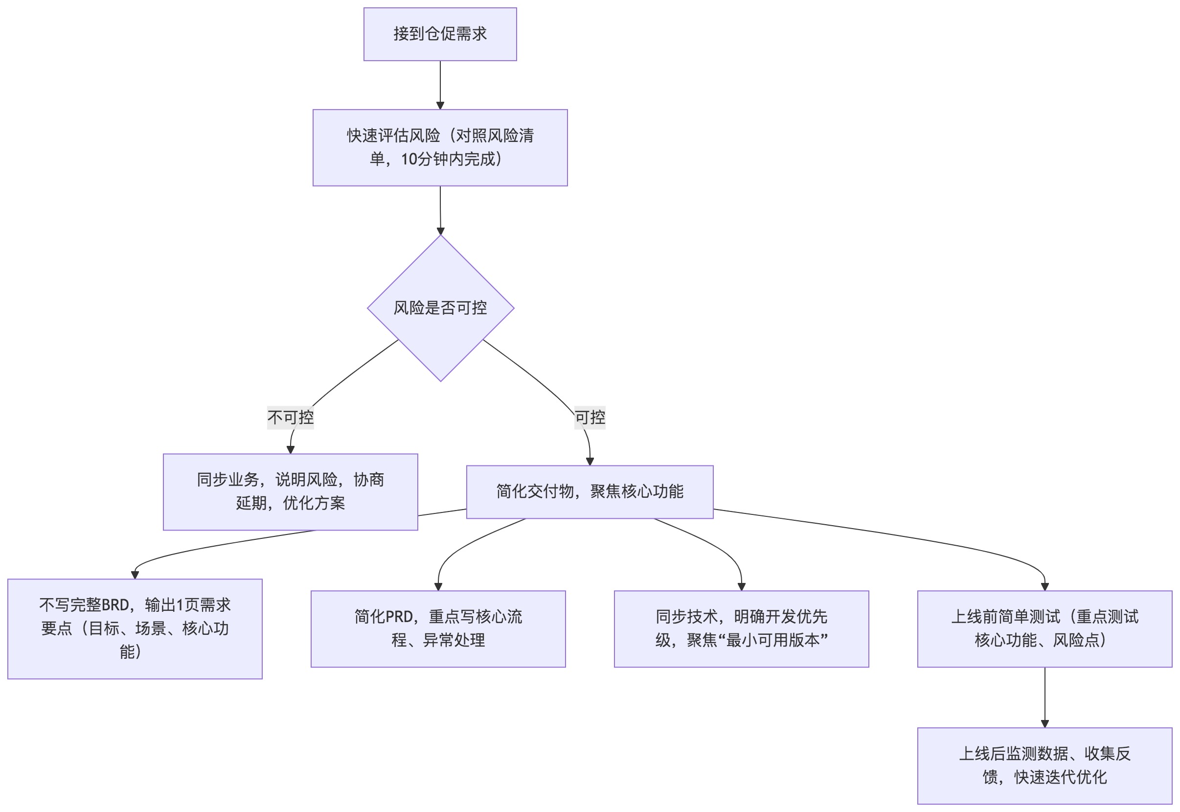 即使是紧急需求,也不能跳过“核心落地环节”,「仓促需求简化落地流程」,既能提升效率,又能控制风险,流程图如下: