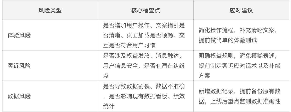 任何仓促需求,上线前必须过“3类风险检查”,整理成「风险评估清单」,同步业务和技术,不盲目上线: