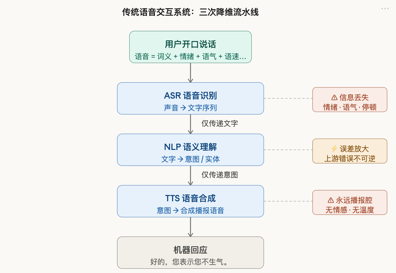 没有ASR→NLP→TTS的接力,也就没有了逐级放大的识别错误。