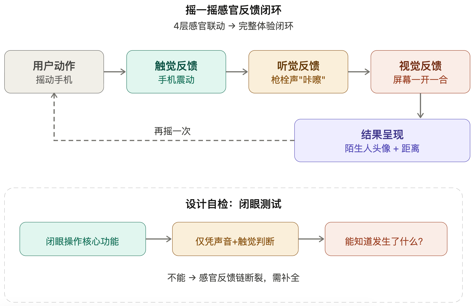 三层叠加在一起:手摇(本体感觉)→ 手机震动(触觉)→ 枪声(听觉)→ 屏幕开合(视觉)→ 结果呈现。这不是一个功能,这是一个完整的感官体验闭环。