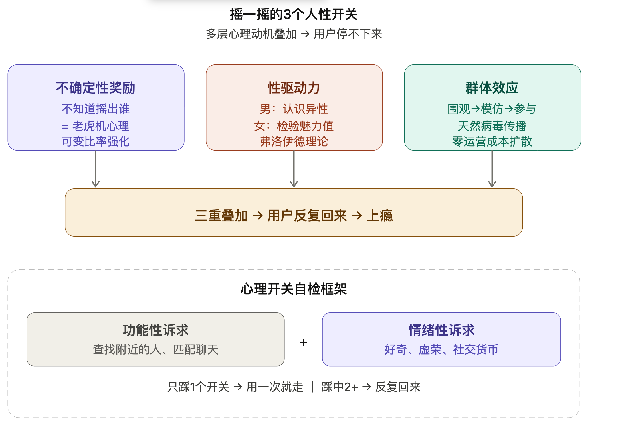 你可以用这个思路审视一下自己产品的核心功能:它踩中了用户的哪几个心理开关?如果只有一个功能性诉求(比如“查找附近的人”),没有情绪性诉求(好奇、虚荣、社交货币),那它很难让用户“停不下来”。