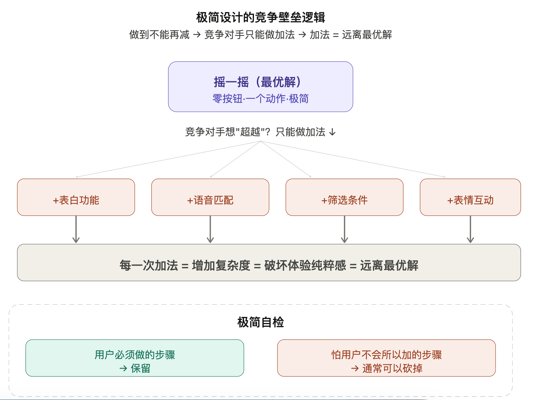 这句话乍听起来有点狂,但细想非常有道理。摇一摇的界面只有一个图案,没有按钮,没有菜单,没有文字说明——它只有一个动作。竞争对手如果想“超越”,只能在这个极简基础上加东西:加个表情、加个语音、加个筛选条件。但任何加法都是在增加复杂度,增加复杂度就是在破坏体验的纯粹感。