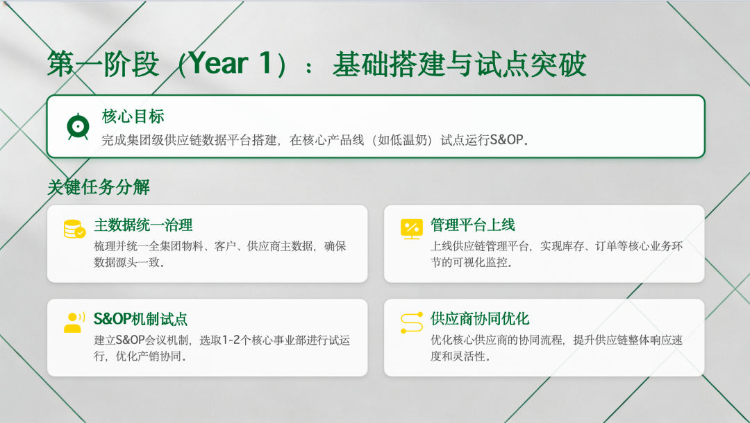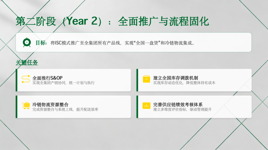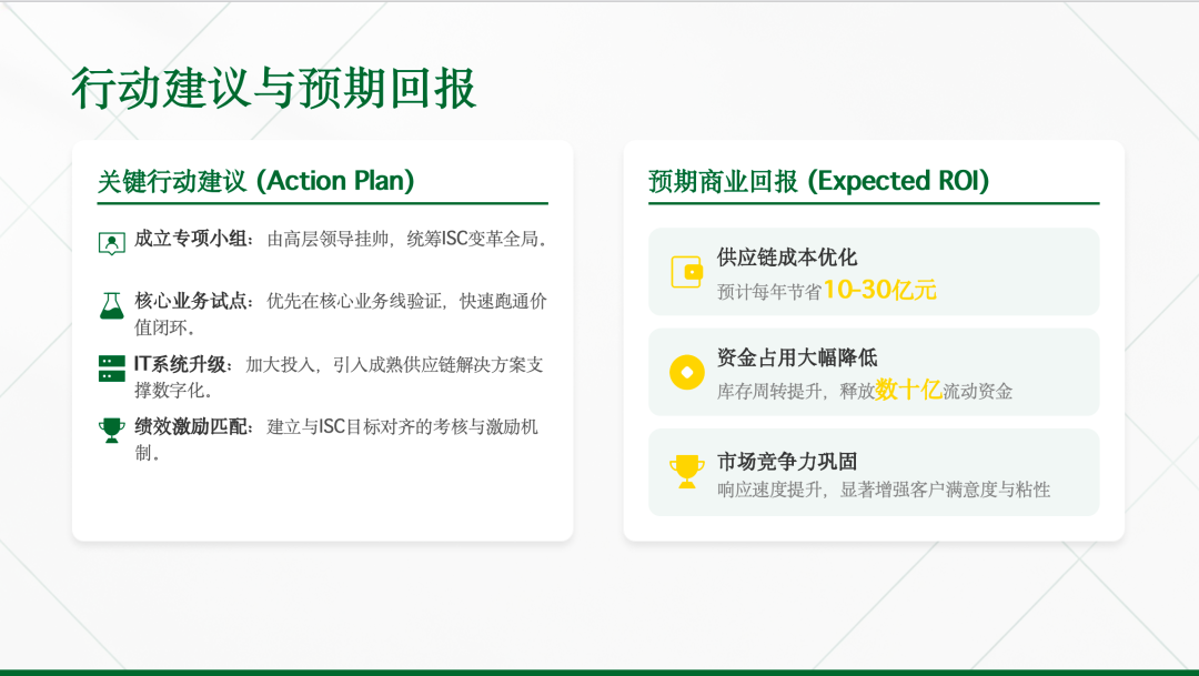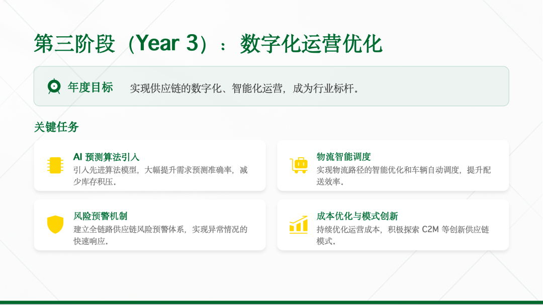 每一年都有清晰目标、关键任务、验收标准,确保AI+ISC转型稳步推进,价值逐年释放,最终实现供应链能力的全面升级,为企业长期发展提供坚实支撑。