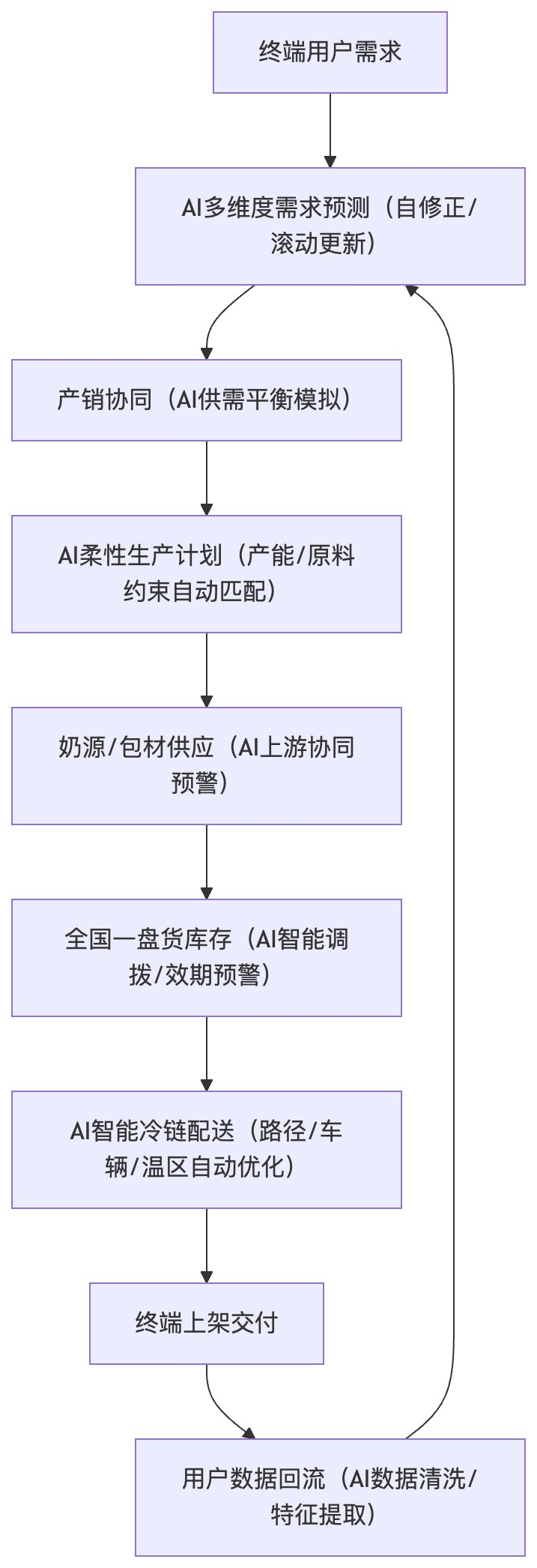 而AI 技术贯穿闭环全环节,成为闭环高效运行的核心驱动力,彻底打破传统供应链 “生产→库存→销售” 的推式模式,转变为 “需求→计划→供应” 的拉式模式,从根源上解决乳业供应链的三大痛点。