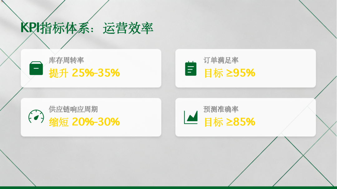 - 库存周转率:基线水平提升25%-35%,加快资金周转,减少资金占用;