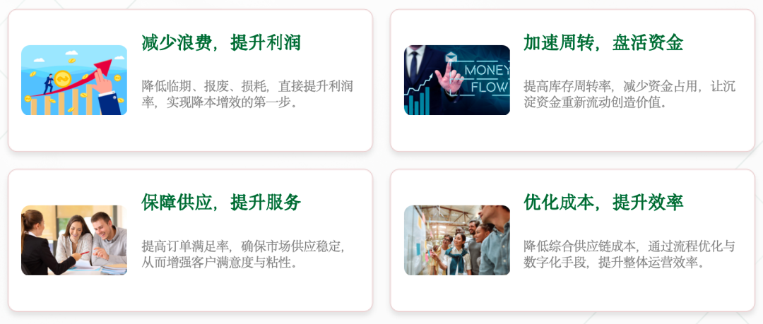 - 快周转,盘活资金流:优化库存结构、减少资金占用,让沉淀在仓库的资金转化为可用于研发、营销、扩张的流动资金;