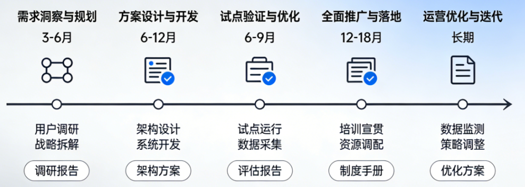 本阶段核心是“试点落地、验证价值、优化方案”,选择1-2个业务线或区域进行试点,快速验证方案效果,周期约6-9个月。