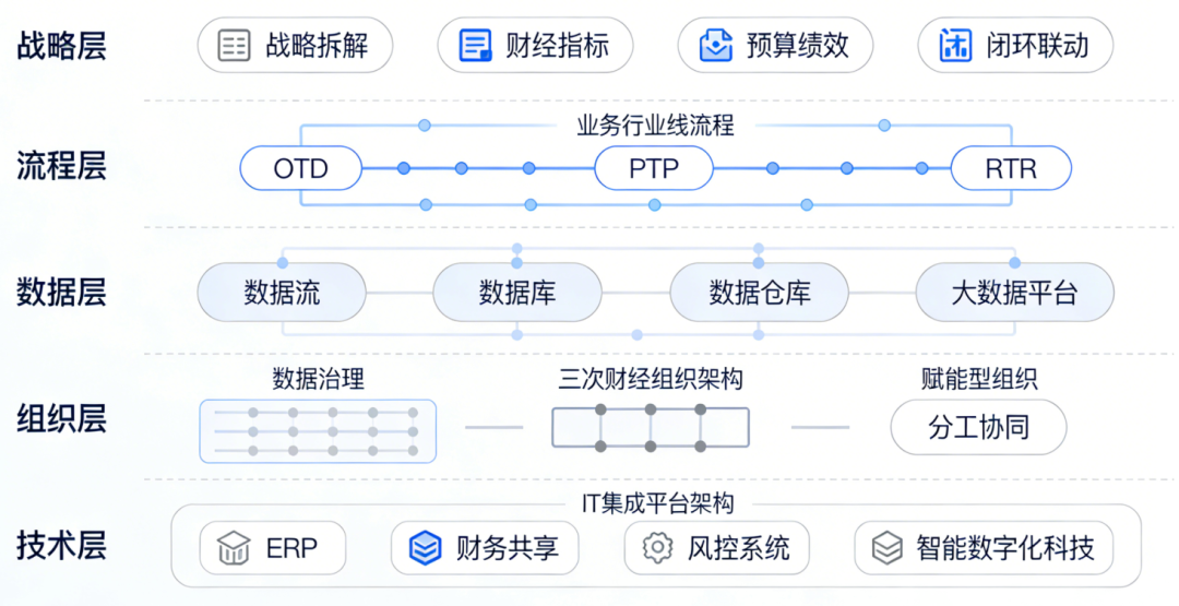 围绕核心业务价值链,重构集成化财经流程,覆盖OTD(Order to Delivery,订单到交付)、PTP(Procure to Pay,采购到付款)、RTR(Recruit to Retire,招聘到退休)三大核心流程域。以OTD流程为例,整合商机管理、合同管理、订单管理、交付管理、开票回款、收入确认等环节,嵌入财务审批、成本核算、盈利分析、风险管控节点,实现流程端到端贯通。