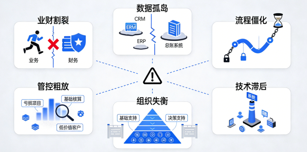 业财割裂是大型企业最核心、最普遍的痛点,表现为业务与财务“目标不同、流程不通、语言不一”,形成“两张皮”格局。从流程看,业务流程与财务流程相互独立,业务部门发起订单、项目、采购等业务时,财务部门仅作为后端审批节点,无法前置参与业务设计与决策;财务核算、报表编制滞后于业务发生,数据反馈周期长达数周甚至数月,业务部门无法及时获取盈利、成本等关键信息,导致决策盲目。