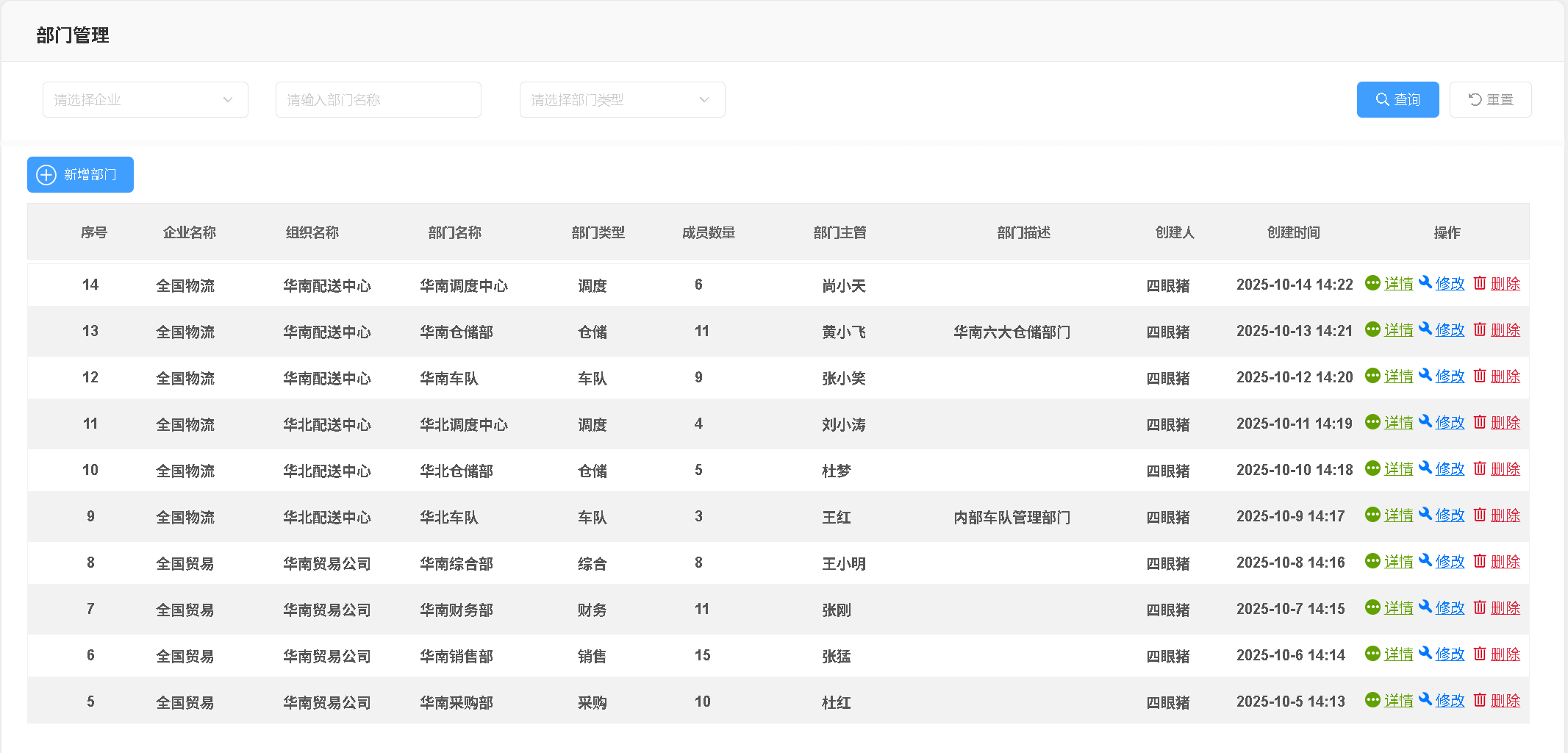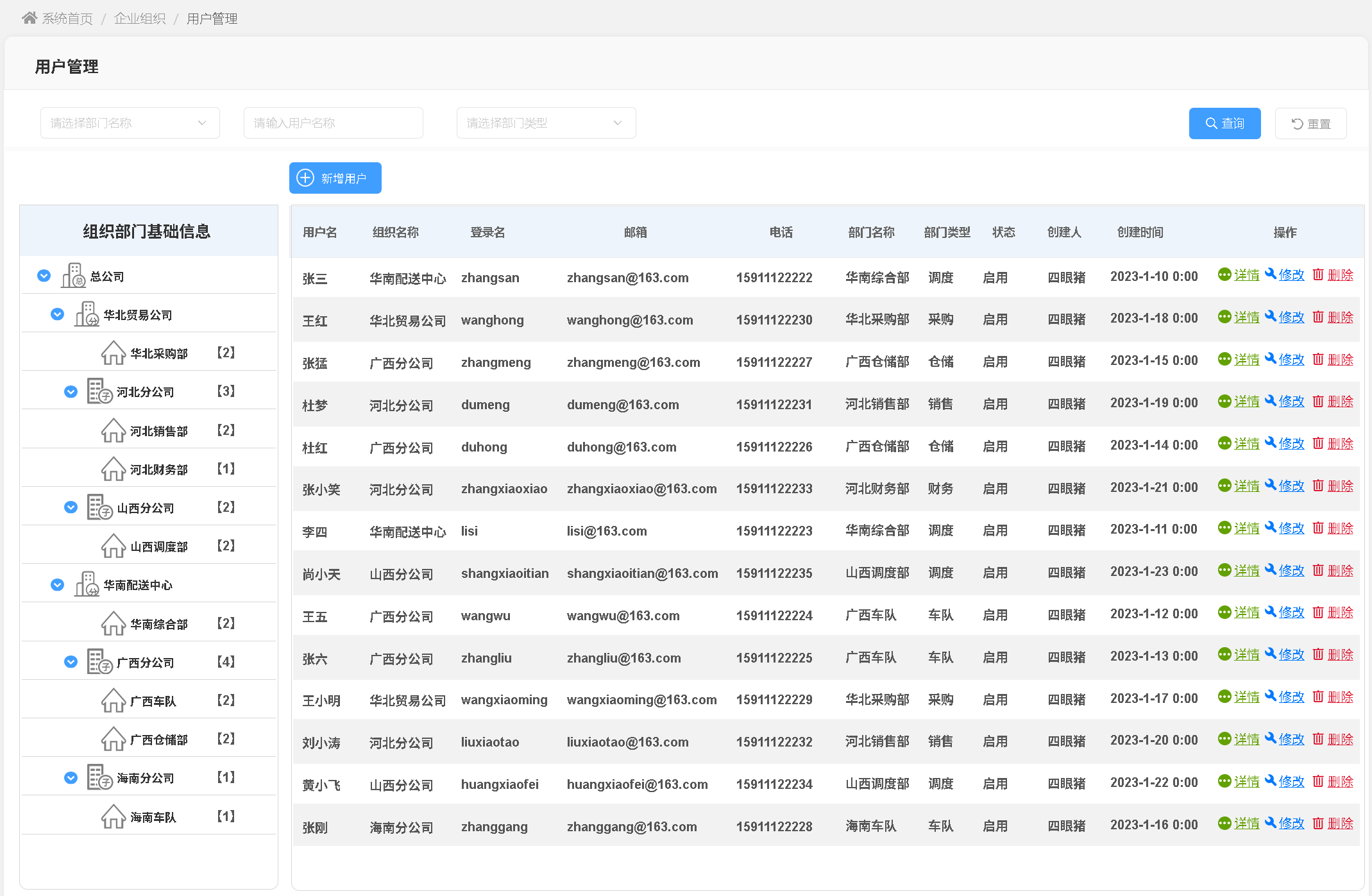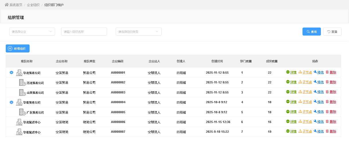 在组织管理页面可完成全层级公司的查询与维护,支持管理员新增一级公司,也可在现有公司主体下快速创建子公司信息,灵活适配企业组织扩张需求。