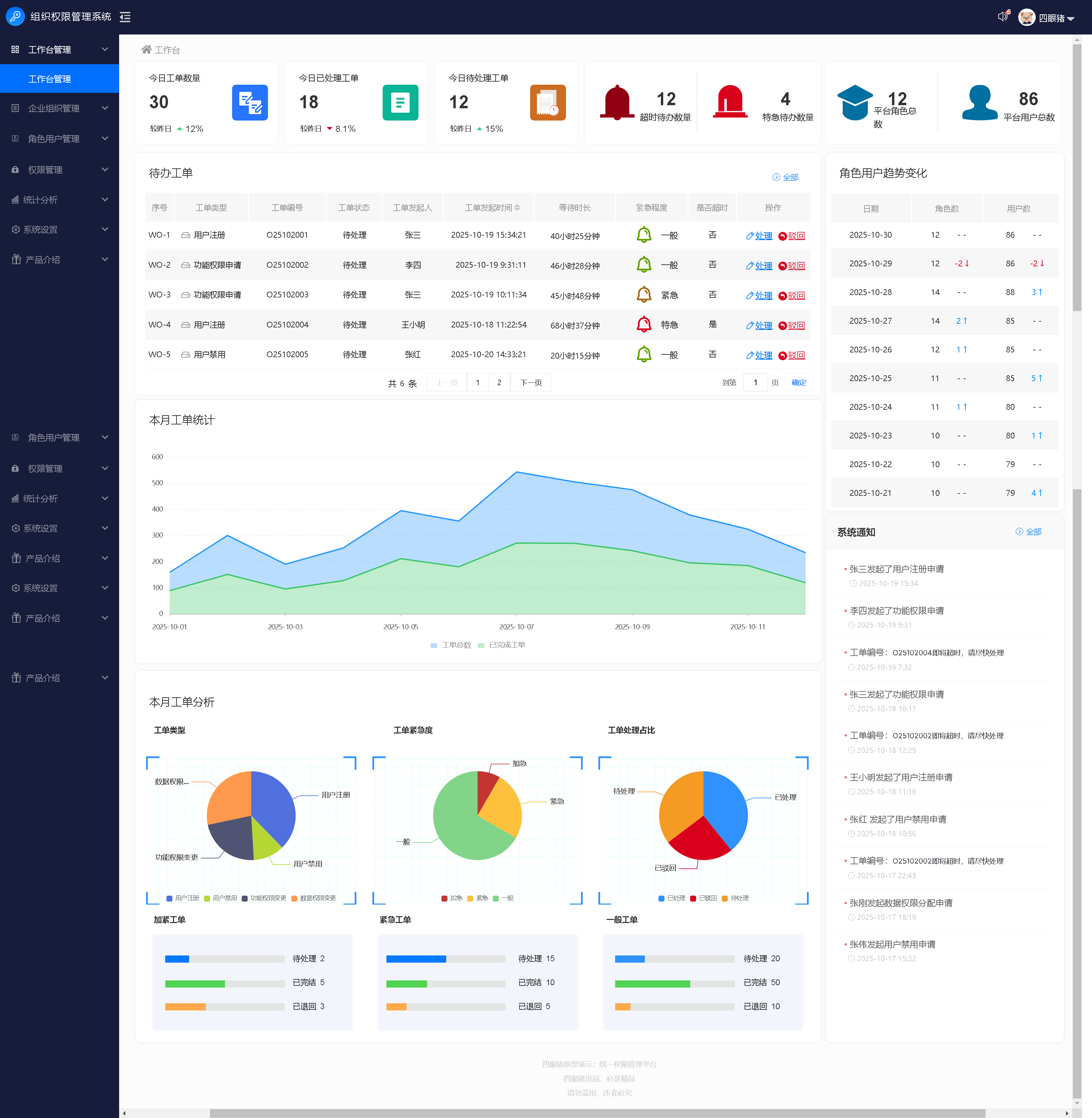 工作台是系统管理员的核心功能页面,需要集中展示工作待办、消息提醒和预警三类核心信息。系统基于精细化数据权限管控,支持为每个管理员分配对应负责的公司/部门工单范围,可确保当有新工单发起时,管理员能第一时间获取提醒、聚焦处理权责范围内的工作,如下图所示: