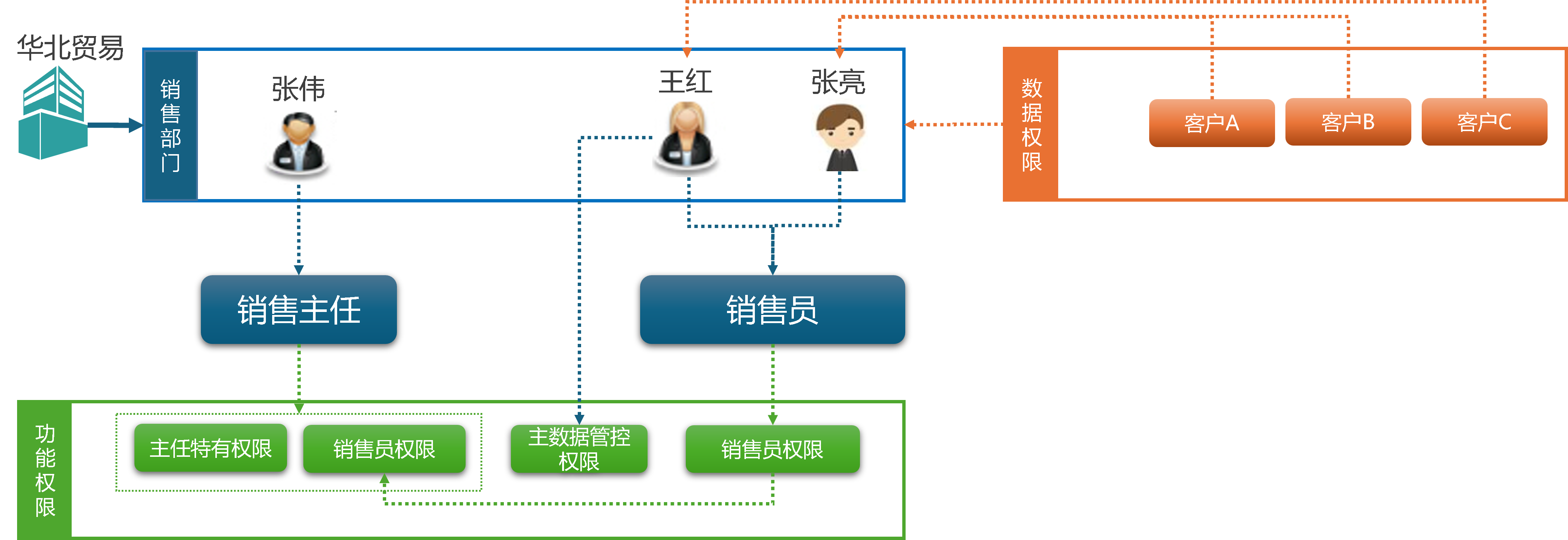 销售部门管理3个客户数据资源, 王红仅能查看客户A的全量业务信息(含报价、需求量、仓库数据等),张亮仅能查看客户B、客户C的业务信息。