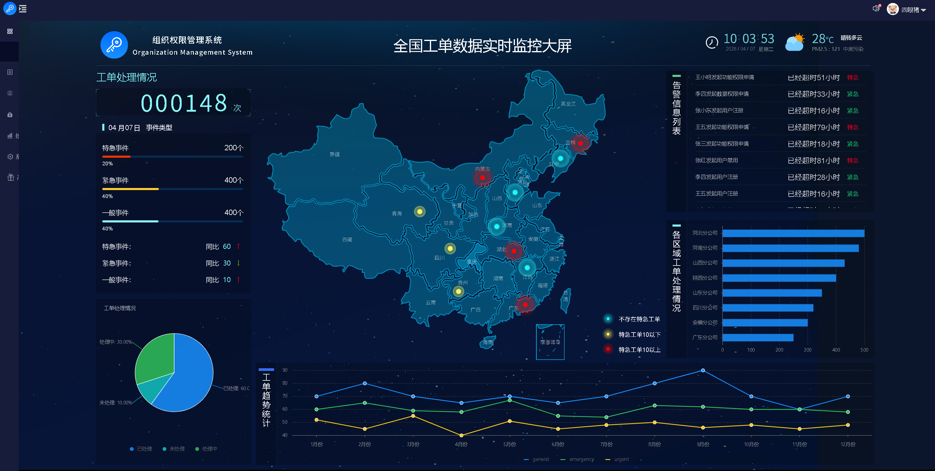 通过可视化监控大屏,集中呈现全地域工单分布态势,同时同步展示告警信息与工单处理趋势,核心运营数据一目了然。