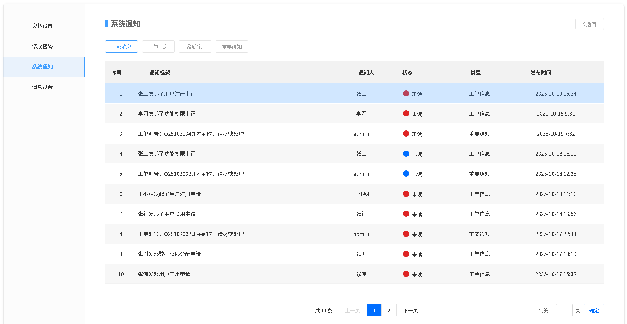 针对工单发起、工单逾期等关键节点,通过消息推送提醒对应管理员及时处理;用户可点击「全部」查看全量系统通知,点击单条通知即可查看对应消息明细。同时支持管理员自定义消息设置,可根据自身关注的消息类型,单独开启或关闭对应通知。