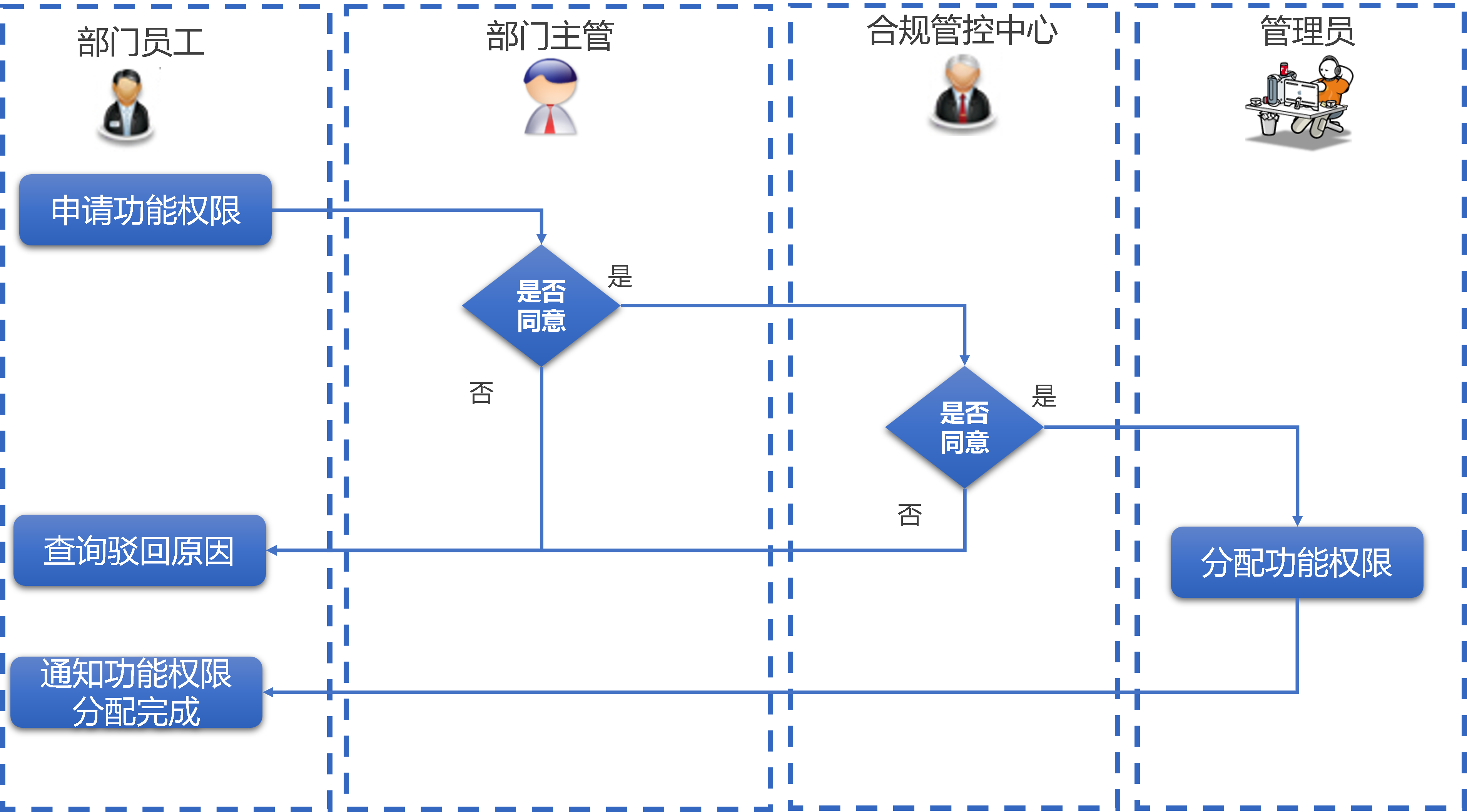 - 权限分配:合规审批通过后,由管理员执行功能权限分配;