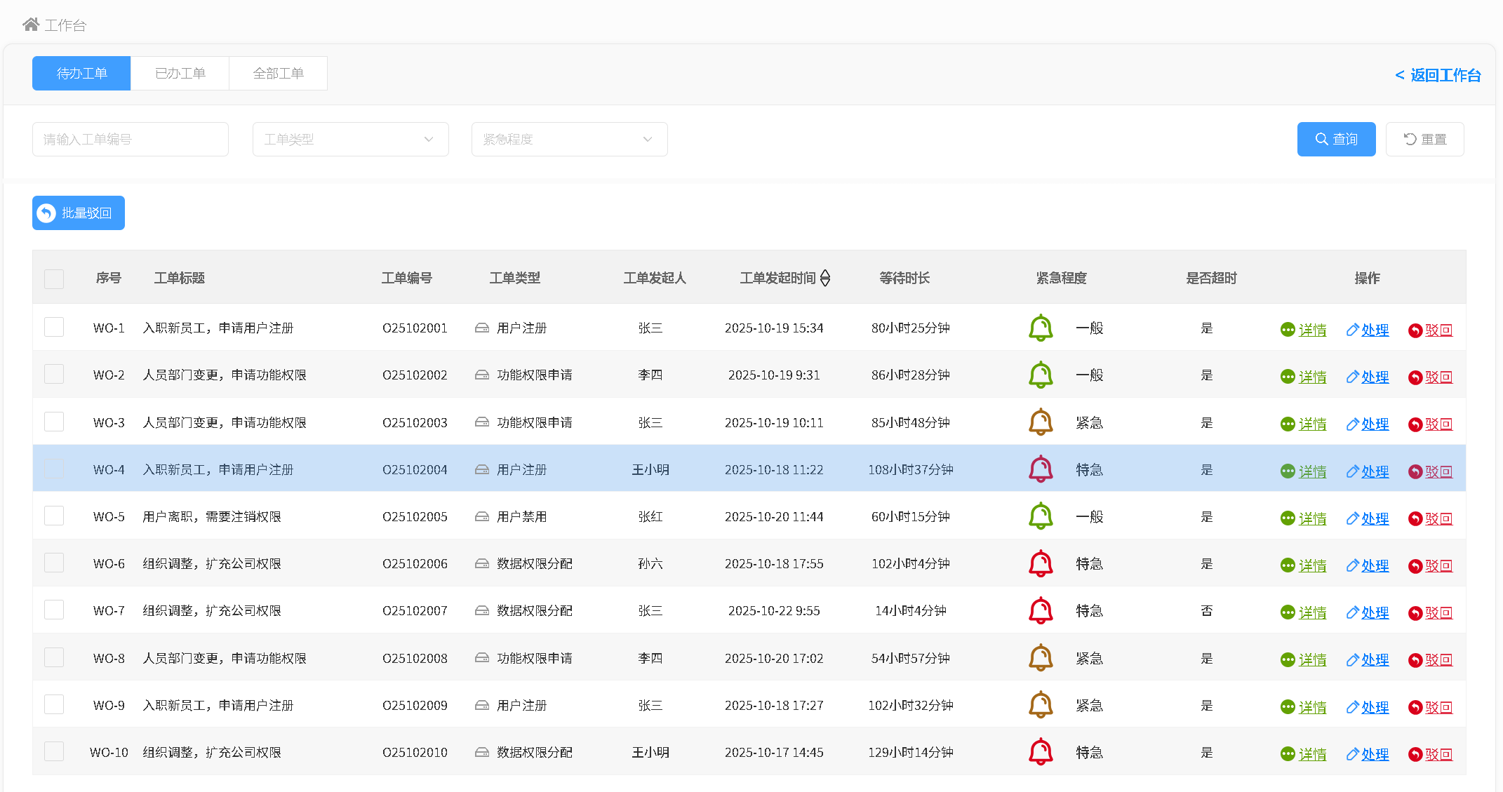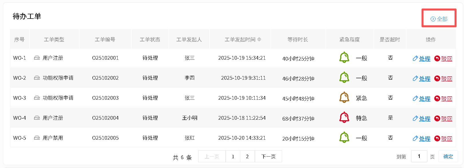 针对待办工单,支持直接点击「处理」跳转至对应工单处理页,也可执行驳回操作。